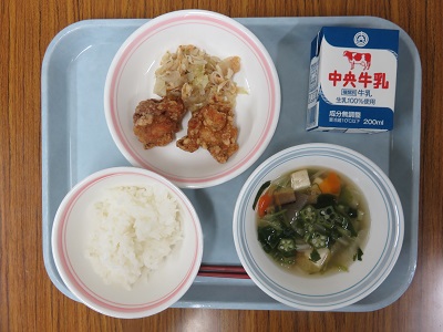 ごはん、牛乳、鶏肉のうま味揚げ、大根とキャベツの煮浸し、オクラのとろみ汁