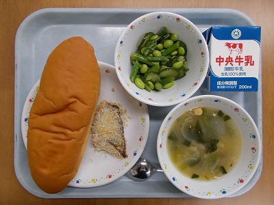 ミルクロールパン 牛乳 タラのサクサク焼き アスパラサラダ スイートコーンスープ
