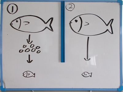 さらに3つの写真を見せます。①サケの写真。②タラの写真。③チョウザメの写真。