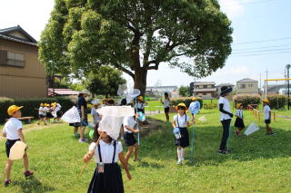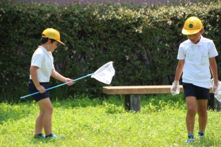 2時間目、2年生が南門を出て行く姿を見かけました。目の前にある、北河田公園へでかけ、夏の虫を探しに出かけました。家から持ってきた網と虫かごを両手に持ち、バッタ、カエル、とんぼ、カミキリムシなどを捕まえて大喜び。観察をするために、教室へ汗を流しながら持ち帰っていきました。