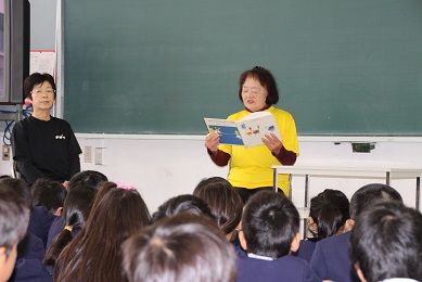 今月は4年生。1つ目の作品は「ゆめのおはなし きいてェな」という絵本でした。障害をもつ方ともたない方のやり取りを通し、お互いを理解し合いながら生活していく大切さに気付かせてくれる絵本でした。2つ目の作品は、「あおよ、かえってこいよ」という紙芝居でした。あおという名の馬と少年が戦争の最中、友情を育む物語でした。毎回、学年に合わせて作品を選んでいただき、心に響く読み聞かせをしていただいております。ありがとうございます。