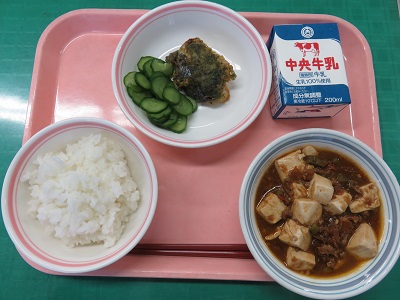 ご飯、牛乳、春野菜入り麻婆豆腐、鰆の磯辺揚げ、きゅうりの塩麴漬け