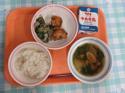 ごはん、牛乳、鶏の唐揚げ、ゆかり和え、なると汁