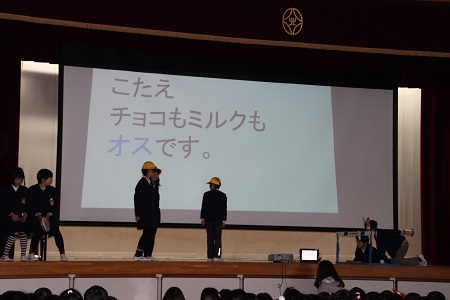 今日の集会担当は、飼育委員会。学校の小屋で飼っている2羽のウサギについてよく知っていもらうために、クイズ形式で紹介してくれました。よく知ることで、正しいお世話ができるようになりますね。