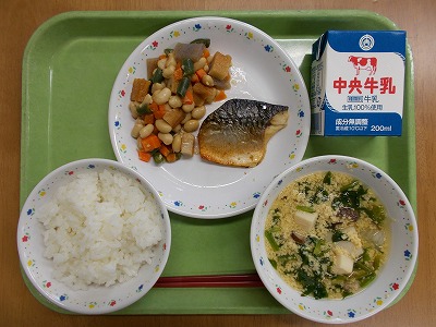 ご飯 牛乳 皮までおいしいさばの塩焼き 大豆の五目煮 かきたま汁