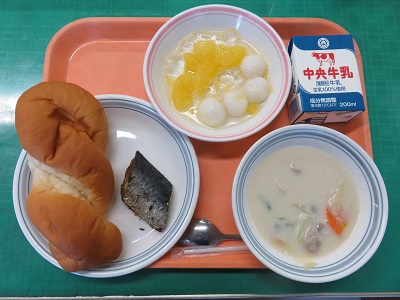 愛知のツイストパン、鰆のバジルレモン焼き、豆乳スープ、白玉入りマスカットゼリーポンチ
