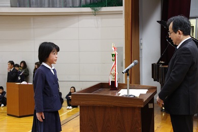 技術・家庭科作品コンクールの入賞者発表がありました。代表で6年生が受け取ります。