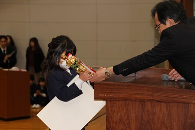 珠算競技会の表彰です。優勝という立派な成績が表彰されました。