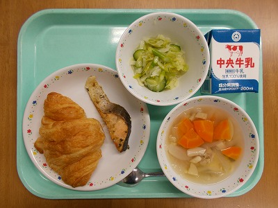クロワッサン 牛乳 マスのハーブ焼き グリーンサラダ アルファベットスープ