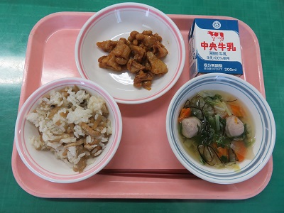 ごはん、牛乳、秋の恵みごはん、れんこんと大豆の甘辛揚げ、いかしんじょう汁