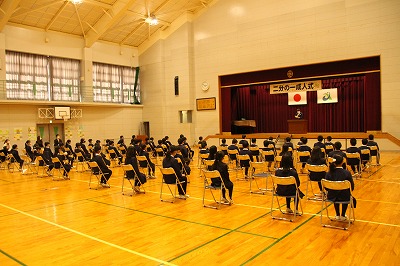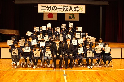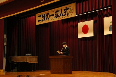 本日、4年生が二分の一成人式を行いました。一人一人が将来の夢や希望を「決意の言葉」として述べた後、校長先生から証書をいただきました。あいにくの寒さでしたが、最後まで立派な態度で式に臨むことができました。今日の誓いを、明日からの生活に生かしてくれることを願っています。