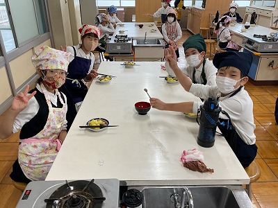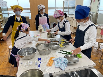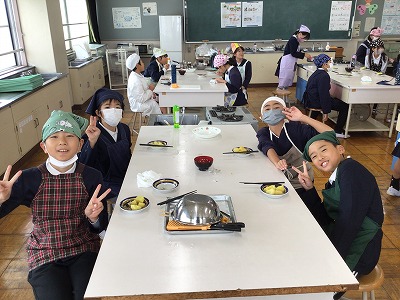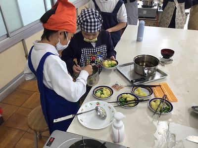 家庭科の調理実習で「ゆでいも、小松菜のおひたし」を作りました。包丁や火の扱い方にも慣れた様子で上手に調理できました。みんなで協力しておいしい料理が出来上がりました。