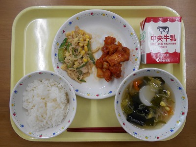 ご飯 牛乳 鶏肉のうま塩唐揚げ ひじきと大豆のうま煮 愛西みつばのかきたま汁