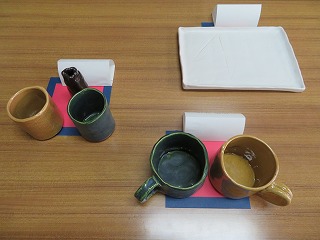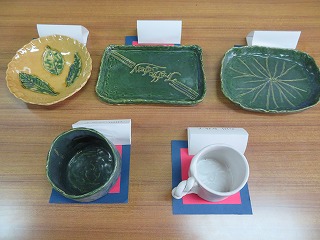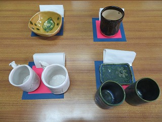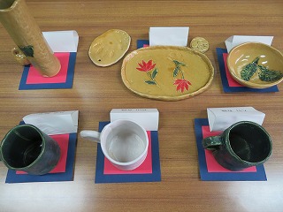 1/17に家庭教育学級(陶芸教室)で制作した花瓶、カップ、皿たちが、焼き上がり学校に届きました。どれも個性的な作品に仕上がり、とっても素敵です。