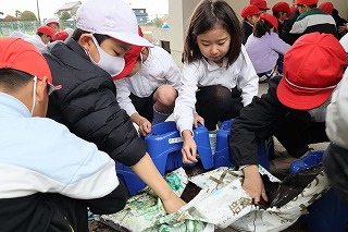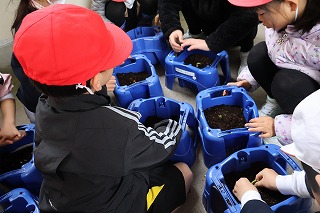 4月に入学してきた1年生も、早いものでもうすぐ2年生になります。「次の1年生のために、お花でいっぱいにしたい!」と、チューリップの球根を植えることにしました。生活科で育てたあさがおのことを思い出しながら、丁寧に土に植えていました。