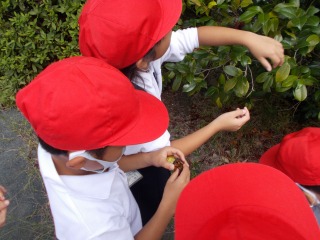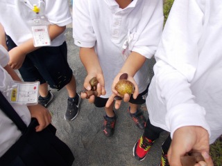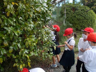 休み時間に1年生の男の子が「この木の実は何ですか」と黒い種のようなものを見せてくれました。上を見てみると、そこには3mくらいの木があり、大きな実がついていました。椿の実です。学校にあるイチョウの木には銀杏が色づき、4年生が育てているヘチマも茶色くなってきました。