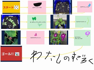 すごろくは、観察記録をまとめた「あさがおにっき」の1ページとなっています。持ち帰りましたら、ご家庭でも話題にしていただき、成長を共に喜んでいただけたらと思います。