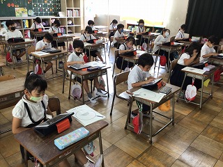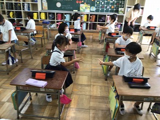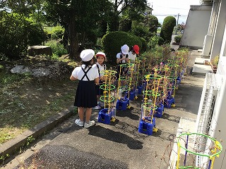 1年生は、生活科の学習であさがおを育てたことをまとめています。種をまいてからずっと大切に育ててきたことを振り返って、あさがおすごろくを作りました。スタートから始まり、「ちいさいめがでたよ」「はっぱがおおきくなってきた」など、生長の様子を一つ一つのコマにしていきました。あさがおの生長だけでなく、「まいにちみずやりがんばったよ」「なにいろのはながさくかたのしみ」など、頑張ったことや思ったこともコマに書くことで、自分自身の成長にも気付くことができたようでした。完成した後は、皆ですごろくを見せ合ったり、じゃんけんをして遊んだりしました。