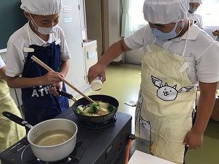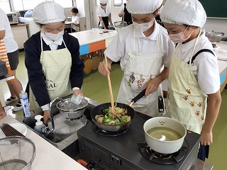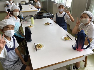10月3日(金)に調理実習を行い、「ハムポテト」を作りました。じゃがいもとブロッコリーを茹でてから、玉ねぎ、ハムと一緒に炒めました。今までよりも調理工程が多い実習でしたが、どの班も手際よく進め、おいしく仕上げることができました。