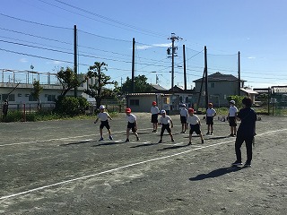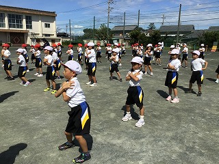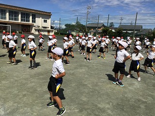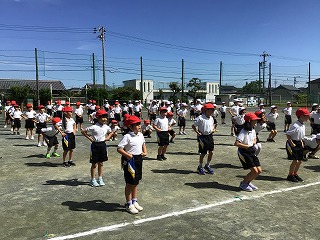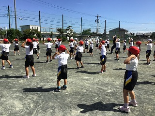 月曜、朝始業時に、約5分間草平体幹体操&草平体幹トレーニングに全校で取り組んでいます。2種類のプログラムを行っています。