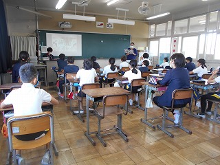 今日は、読み聞かせボランティアの皆さんが、5年1組で小手鞠るい作「うちのおかあちゃん」を読んで聞かせてくださいました。視力を失っていくお母さんが、つらい状況の中明るく家族に接したり、毎日を元気に過ごしたりしている様子が描かれています。ほのぼのとした印象のイラストや、ボランティアさんの軽快な口調に聞き入る子どもたちの様子が見られました。読書の秋。ぜひ、ご家庭でも皆さんで読書に親しんでいただけたらと思います。