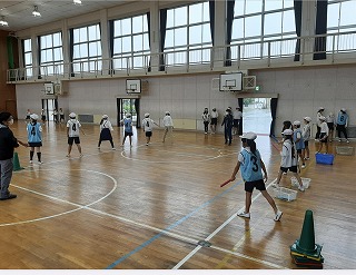 月曜、朝始業時に、約5分間草平体幹体操&草平体幹トレーニングに全校で取り組んでいます。2種類のプログラムを行っています。
