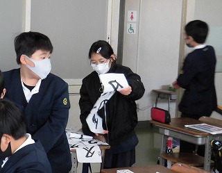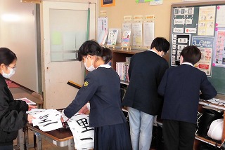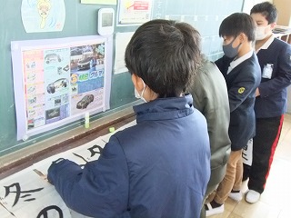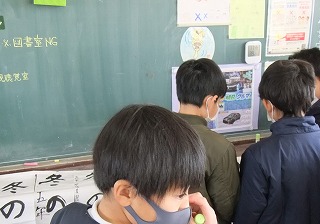5年生の教室では、冬休みの宿題だった書き初めを掲示する作業を行いました。今回は、この掲示の手伝いを5年生の児童が行いました。掲示しやすいように、紙テープを使い、数名分の児童の作品をまとめました。細かい作業でしたが、一生懸命に取り組みました。