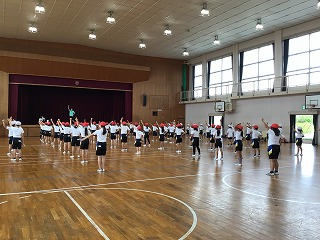 月曜、朝始業時に、約5分間草平体幹体操&草平体幹トレーニングに全校で取り組んでいます。2種類のプログラムを行っています。