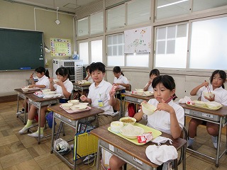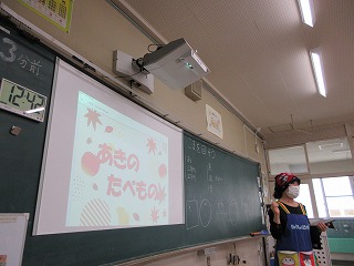 運動会まであと少し!今日の給食はみんなが大好きなカレーめんでした。学校近くの佐織製麺から届けられた熱々の麺と調理員さんが作ってくださったカレーを、どの子も嬉しそうに食べていました。栄養教諭の森田先生から、秋の食べ物の話を聞きました。