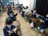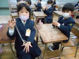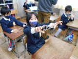 あやとりで遊ぶのが初めてだという子もいれば、これまでに何度もやったことがあって「ほうき」や「〇段ばしご」の技を見せてくれる子もいました。基本の持ち方を練習したり、スクリーンで技の動画を見たりしました。授業の中だけでなく、休み時間にも友達同士で教えあいながら、できる技が増えるといいなあと思います。