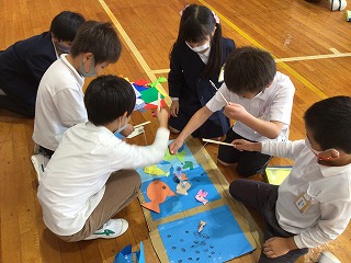 体育館を広々と使い、生活科「おもちゃランド」を開催しました。1時間目と2時間目で、お店屋さんの役を交代しながらおこない、楽しく遊びました。歓声と笑い声にあふれ、大盛況に終わりました。どの子も、友達の作ったおもちゃを大切に扱う姿が見られました。また、景品を渡したり、ルールや並ぶ場所を案内したりと、同級生をお客さんとして優しくもてなすことができました。