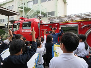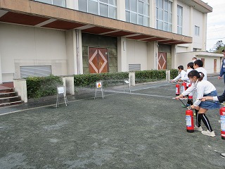 3年生は、防災教室で愛西市消防署分署の方から消火器の使い方を教わりました。「ピン(ピンを抜く)・ポン(ホースを持つ)・パン(ハンドルを握る)」を合言葉に、素早く消火体験を行いました。その後、タンク車の見学をしました。消火活動をするために、様々な装備があることを知りました。今後の学習に生かしていきたいです。
