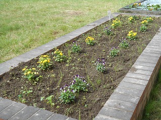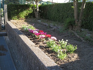 東門の横の花壇には、色とりどりのビオラとシクラメンがみんなを出迎えてくれます。