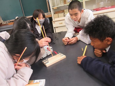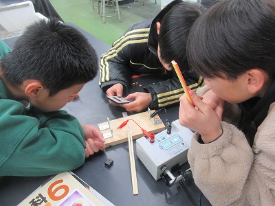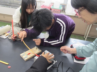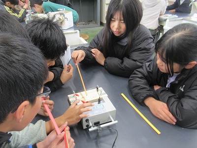 答えはすぐに見つけられました。そこで、発泡スチロールカッターは、この仕組みを使っていることを伝えると、自分たちで、電熱線に電流を流して確かめていました。