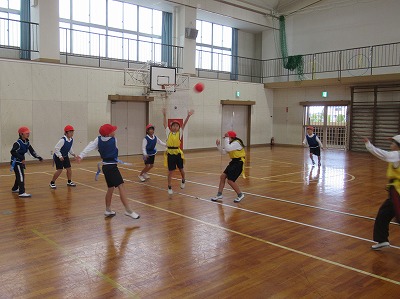 ゲーム形式に入っています。ラン攻撃・パス攻撃といった攻めるには、みんなの作戦が大きなポイントとなっています。そして、それを守るためにはどうしたらよいか?守備側も作戦を考えます。切磋琢磨ができる3年生、何でもやってみる3年生、だからこそ成長するし、楽しいのでしょうね。とても活発で、声が響いた体育館で楽しそうに活動しています。