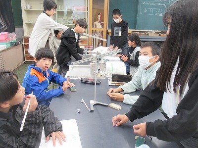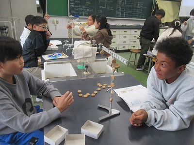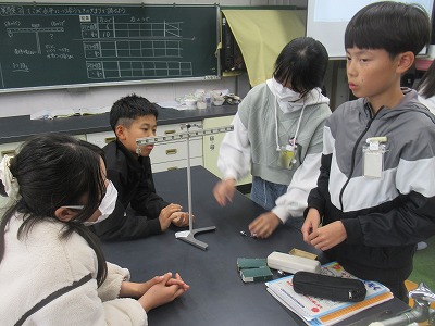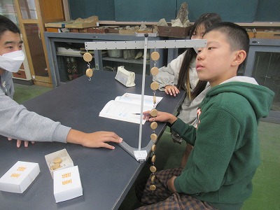 今回は、「実験用てこ」を使って、左右のうでにおもりを吊るして、つり合う時のきまりを探りました。つり合う時の、「支点からの距離」と「おもりの重さ」を表にすると…。何度か試していくうちに、あるきまりを見つけて、どの位置にいくつ吊るすとつり合うのかを導き出すことができていたようでした。