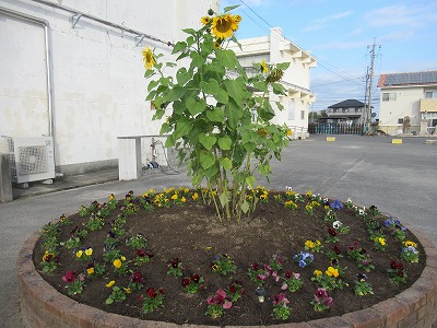 玄関前の丸花壇に、チューリップの球根をうえて、春には赤・白・黄色・ピンク・紫のチューリップが咲いてくれます。200球以上を、有志の児童でうえました。