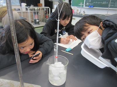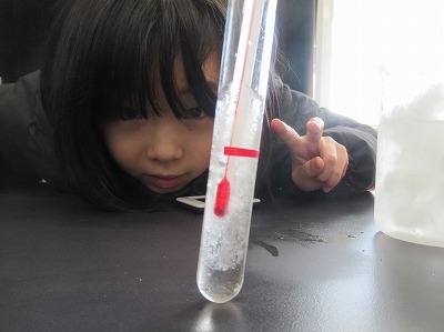 「どこから冷えるのだろう?」「温度変化はどうなるのかな?」「印をつけたところから(体積が)増えるのかな?減るのかな?」と、予想をもちながら実験を進めました。試験管内の水が凍って氷になることは、体験の中では知ってはいる事象ではありますが、じっくりと観察する機会はないですよね。目を輝かさせて取り組んでいました。