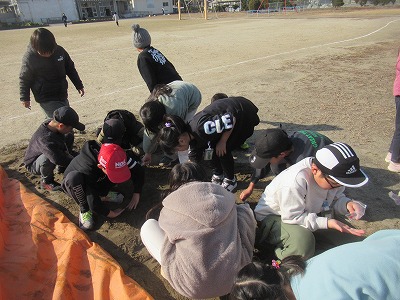 追活動:砂鉄探し➡磁石にくっつく小さな粒を探しに行こう!(運動場・校庭・砂場にある砂鉄を磁石を使って探している&砂鉄ゲットした様子です♪)