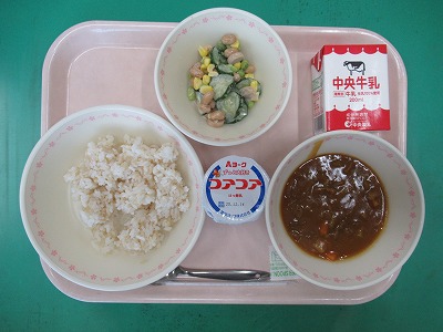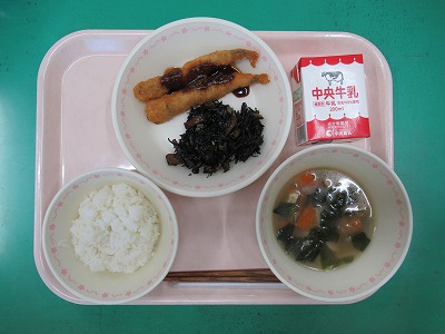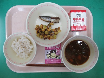 本日の献立:麦ごはん・牛乳・いわしの梅煮・さつまいもと大豆ののり塩風味・五菜三根のみそ汁・ふりかけ(おかか)