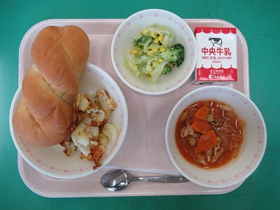 本日の献立:愛知のツイストロールパン・牛乳・じゃがいもチーズ焼き・イタリアンサラダ・もち麦入りミネストローネ