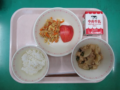 本日の献立:ごはん・牛乳・豚肉と大根の煮物・にんじんしりしり・りんご