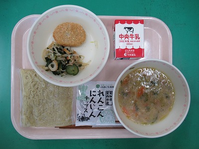 今日は「食育の日献立」です。今日のみそ汁に使用された五菜は「かぼちゃ・みずな・みつば・しめじ・ねぎ」、三根は「れんこん・だいこん・にんじん」でした。野菜をみそ汁の具材とすると効率よく栄養を摂ることができますね。