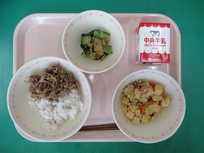 本日の献立:豚ごぼう丼(麦ごはん)・牛乳・高野豆腐の卵とじ・昆布和え