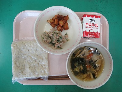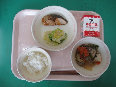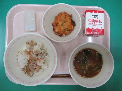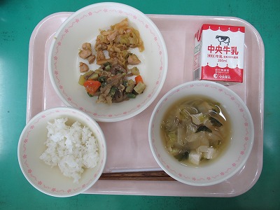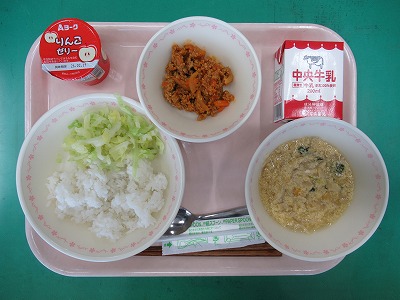 本日の献立:ミルクロール・牛乳・手作りチーズオムレツ・ブラウンシチュー・みかんゼリーポンチ