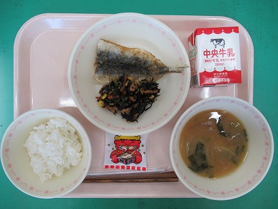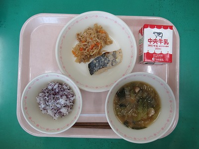 本日の献立:ゆかりご飯・牛乳・さわらのマヨネーズ焼き・切り干し大根の炒め煮・お餅入り野菜汁