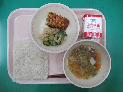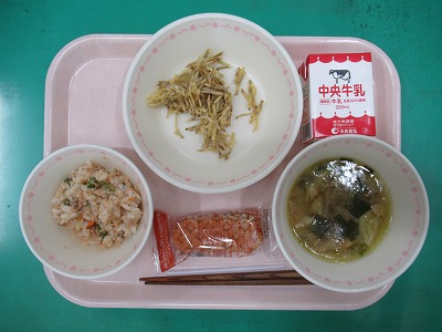 本日の献立:ツナそぼろご飯・牛乳・ごぼうの香味揚げ・春雨スープ・メープルドック