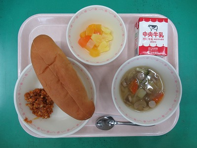 「スラッピー・ジョー」は、牛ひき肉(今日の給食では、豚ひき肉+大豆)・タマネギ、トマトソース、ウスターソースから作ったミートソースをパンやバンズで挟んだ料理です。アメリカの料理人が作ったのが始まりと言われています。簡単に、手軽に作れて食べられるのでアメリカでは人気の食べ物だそうです。日本では、2010年代に学校給食で出されたようです。