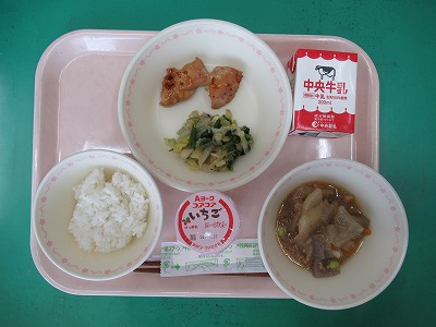 本日の献立:ご飯・牛乳・焼き鳥・大根のそぼろ煮・おかか和え・いちごヨーグルト