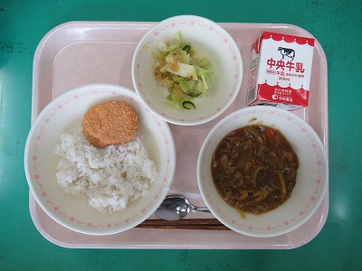 本日の献立:だし香る和風カレー(麦ごはん)・牛乳・米粉の和風コロッケ・福神和え